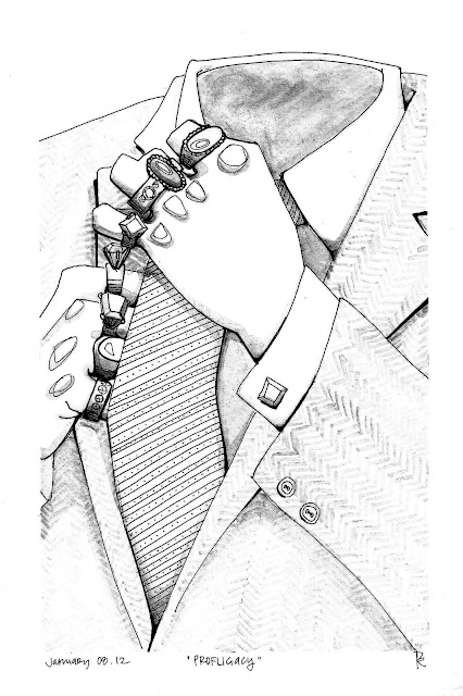 I really cannot explain why I thought of a businessman with today's Word...maybe the whole 'shameless dissoluteness' thing, or as I understood it, 'shameless lack of morals,' and thus the Suit & Tie. It makes sense when you just watched the complete Third Season of Dexter, featuring a ruthless Assistant DA (Jimmy Smits) with more than a little blood on his fingers–here, the fingers each sport a precious rock to represent his reckless extravagance and great abundance in non-practical items.